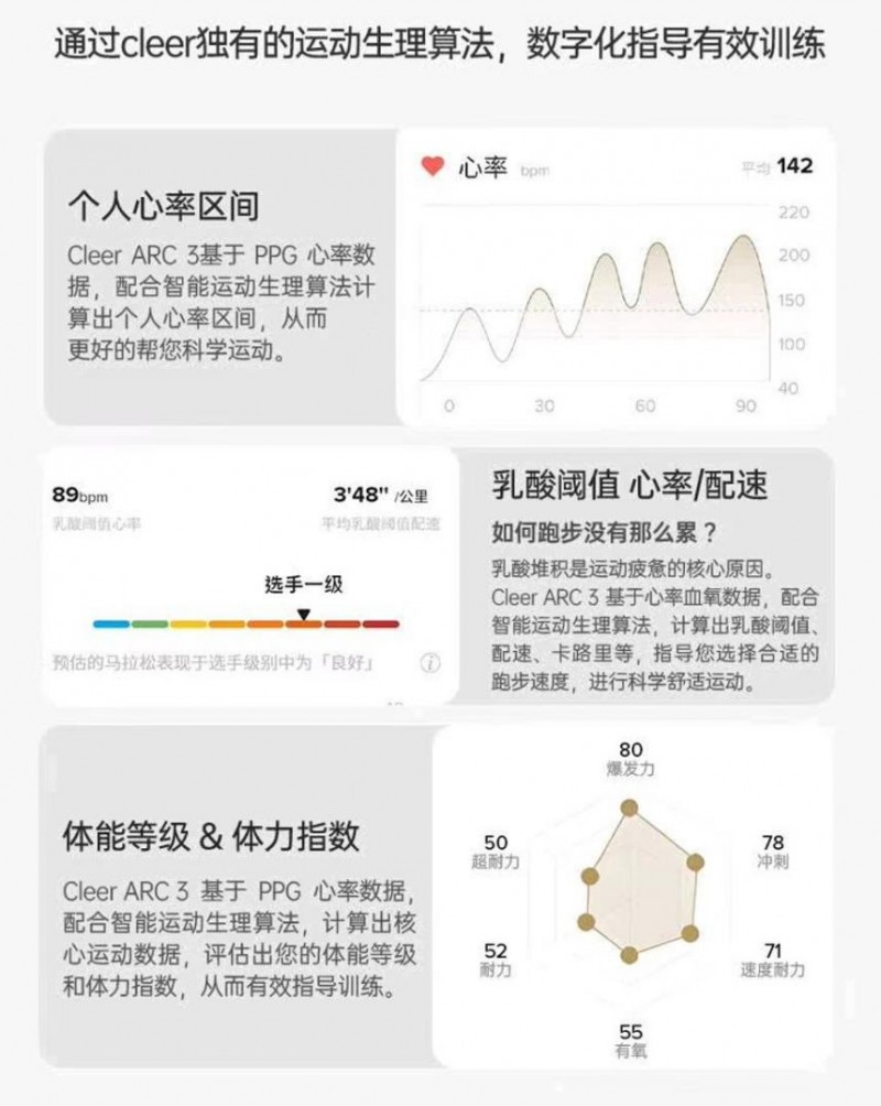 Cleer has closely collaborated with GoMore, a top global professional sports science and AI intelligent coaching service provider, to equip the ARC 3 Sound Arc Sport Pro with a series of comprehensive algorithms including personalized heart rate ranges, key aerobic indicators, energy consumption, and more. Not only does it help to accurately evaluate athletic ability, but it also enables real-time monitoring of training effectiveness, providing users with a more scientific and reasonable training plan.
