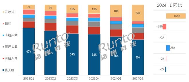 其中開(kāi)放式(OWS)耳機的爆發(fā)是耳機市場(chǎng)增長(cháng)的主要驅動(dòng)力。因不入耳、不傷耳的舒適安全佩戴設計,開(kāi)放式耳機成為了各大廠(chǎng)商今年以及未來(lái)重點(diǎn)布局的產(chǎn)品線(xiàn)之一。根據洛圖科技(RUNTO)線(xiàn)上監測數據顯示,2024年上半年,開(kāi)放式耳機在線(xiàn)上耳機市場(chǎng)的份額達到了20.9%,較去年同期增長(cháng)了12.7個(gè)百分點(diǎn),銷(xiāo)量同比大幅增長(cháng)165%,是整體耳機市場(chǎng)的絕對增量。其中,在2024年第二季度的銷(xiāo)量占比進(jìn)一步擴大,已接近市場(chǎng)四分之一。